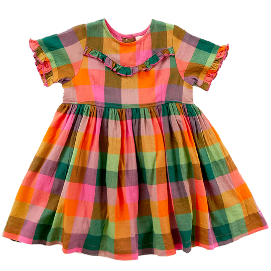 Ruffle trim adorns our sweetly stylish Girls' Amelia Dress, designed in cotton gauze and fully lined on top. A vibrant plaid print brightens the look, accented by shimmery buttons on back. Pairs perfectly with the Baby Amelia Bubble Romper for a coordinated Big Sister/Little Sister look.