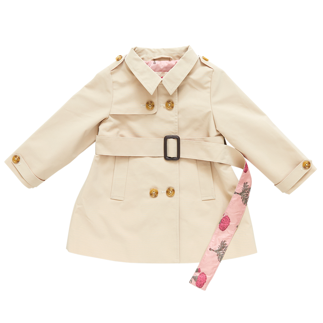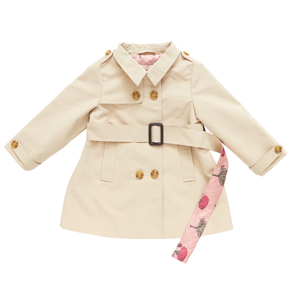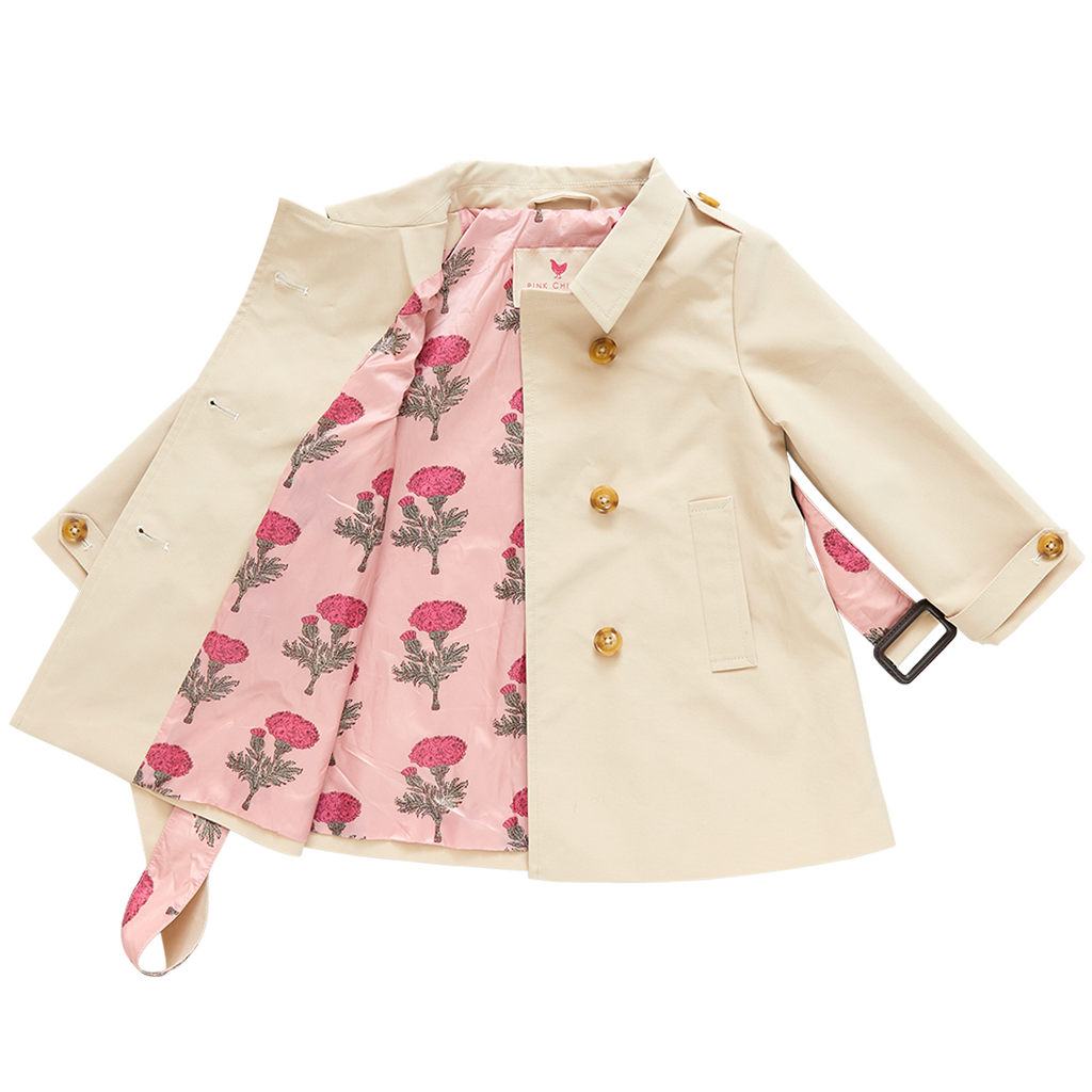 New and Notable! Our Girls Trudy Trench Coat is a super chic addition to your little's wardrobe. Open the classic double breasted beige trench to find our gorgeous Blush Marigold print lining the coat's interior. Exceptional details really set this piece apart: faux horn buttons up the front and at the shoulders and wrist; removable fabric lined belt with faux leather slide buckle and roomy side slit pockets. Wear Trudy rain or shine, you won't want to hide it in your closet! Full length. Water resistant.
