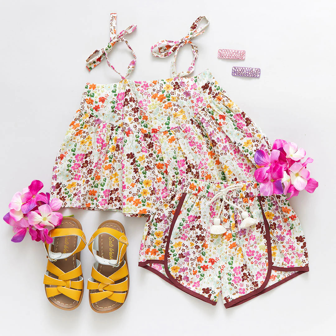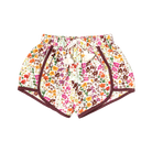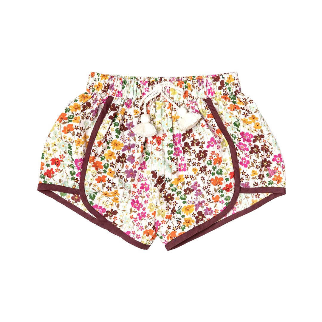 Wild Flowers! This multi-colored ditsy floral with shimmery copper detail brings a field of fun to our sporty Girls Millie Short. Tassel accents and maroon trim detailing evoke a fun, free-spirited vibe.