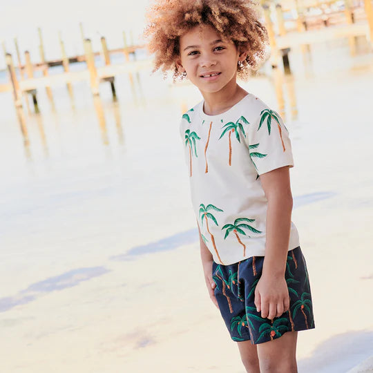 Island Vibes! Beachy coconut palms stand tall on a white sand background in our tropical Cream Palm Trees print, shown here on our Kids Organic Tee. A solid crewneck and boxy, comfortable fit define this playful wardrobe staple. Loomed in GOTS-certified organic cotton with a touch of stretch to allow for easy movement. Our inks and dyes are classified eco-friendly by OKEO-TEX criteria. You'll find this breezy print woven throughout our newest collection of Organics.