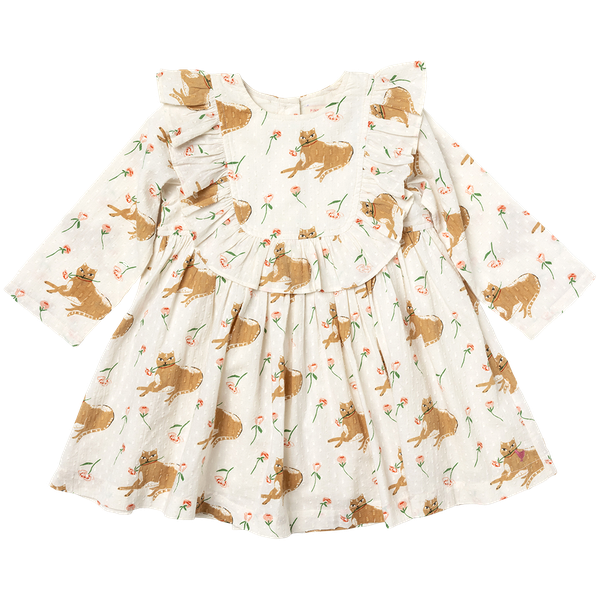 We joined forces with artist Berry Aktuglu on our serene Cats n' Roses print. Sweet tabbies lounge amid rosey stems on our new to the collection Girls Michaela Dress. This stylish silhouette is crafted from an all over Swiss dot fabric and boasts a fanciful ruffled bib, long sleeves and our bronze glitter buttons at the back. Pair with our Baby Girls Michaela Dress set for a sweet sibling statement.