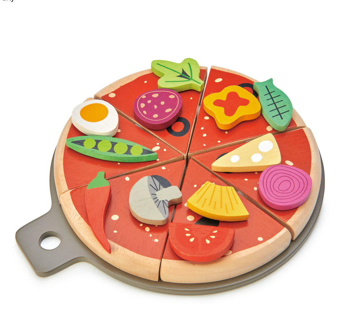 Everyone loves pizza! Now you can create your own and get delivery in our very own Tender Leaf illustrated pizza box. Pre-cut into 6 slices and arranged on a pizza tray, have fun arranging 12 different toppings. All the toppings are inter-changeable and held in place by a small velcro spot.