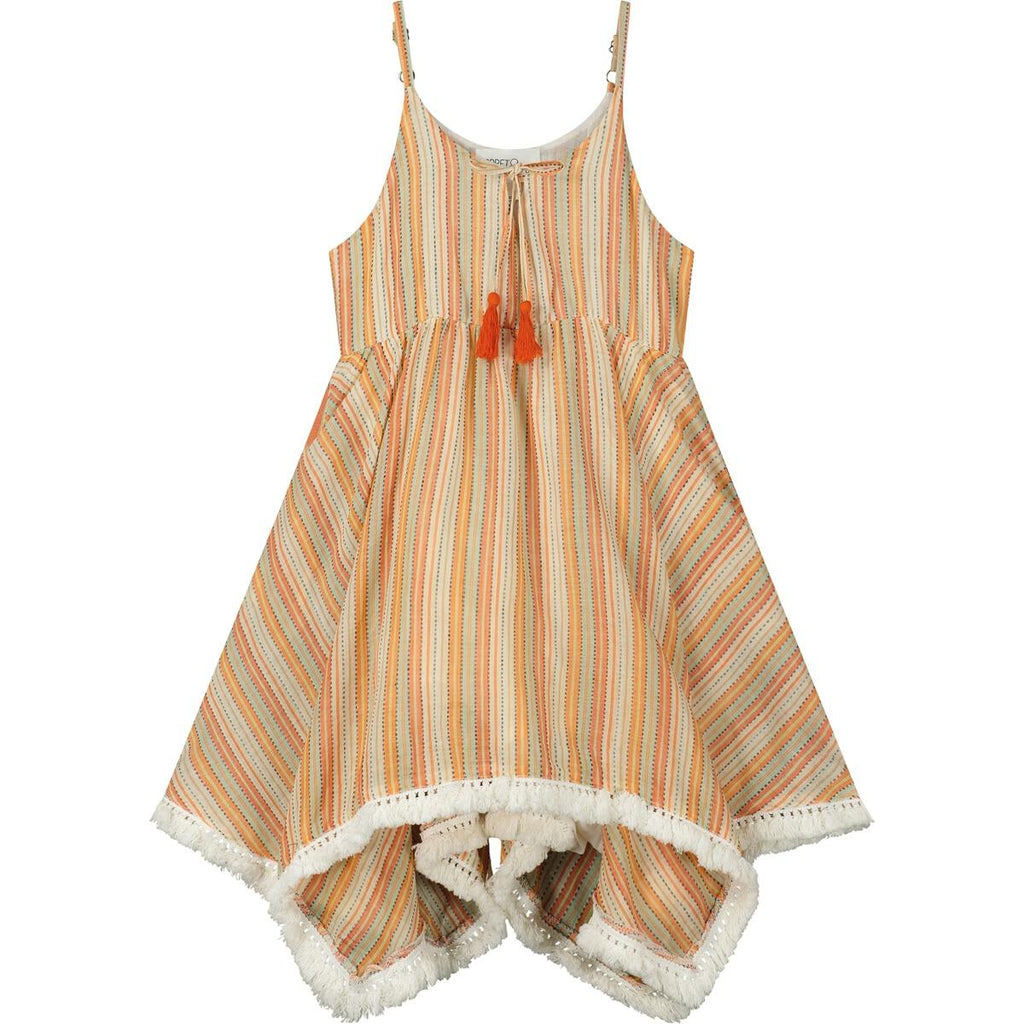 This pretty handkerchief hem dress is very flattering, with adjustable straps for a perfect fit. Featuring a softly fringed hem and tassel ties at the neck.