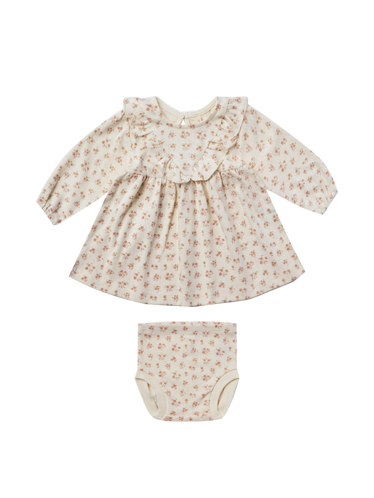 Long sleeve dress with sweet ruffle detail in our classic pointelle fabric. Button back closure for easy changing.