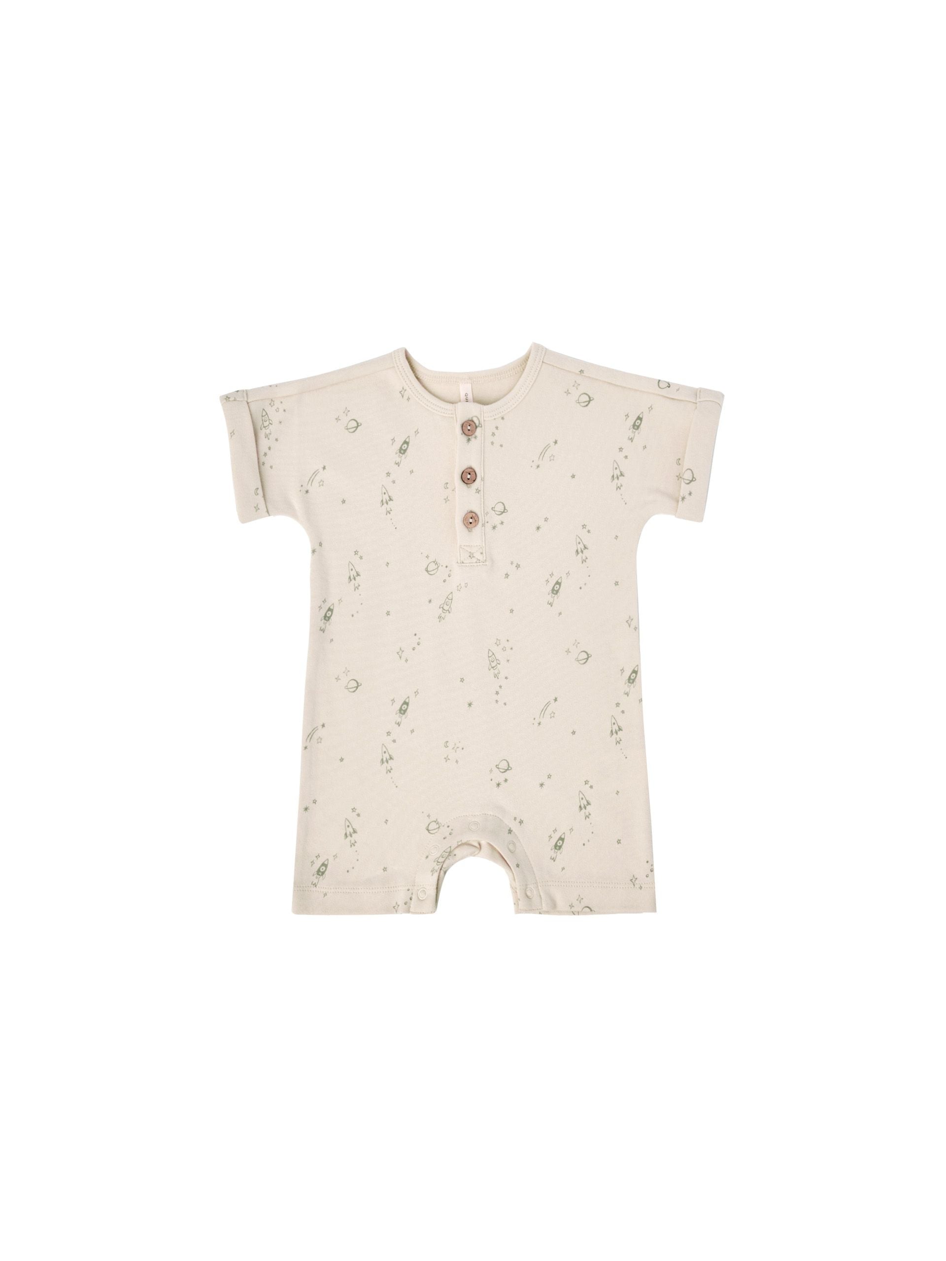 Our new short-sleeve romper has folded cuffed sleeves, wood buttons down the chest and snaps along inseam for easy changing. The perfect light-weight summer staple!