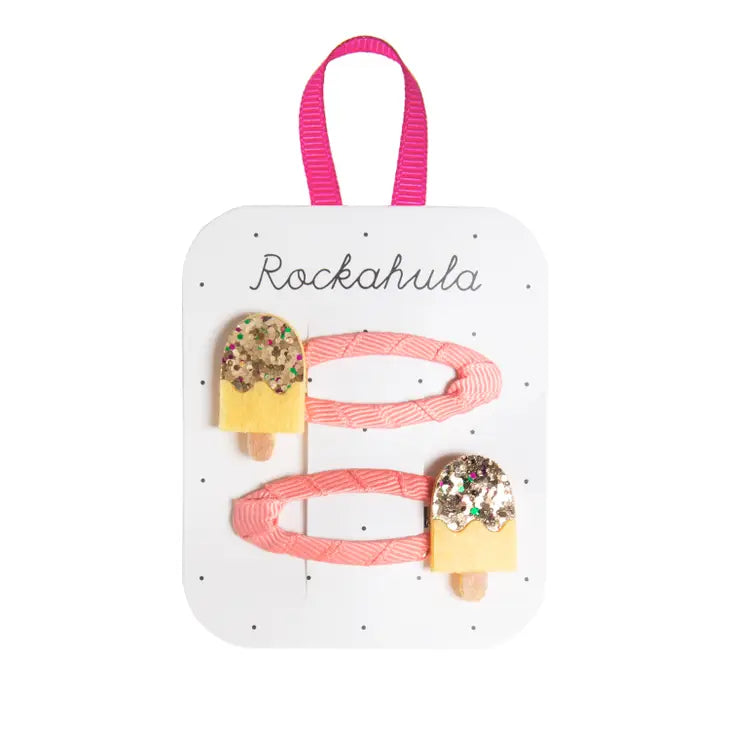 These super cute Lolly Clips are perfect for anyone with a sweet tooth! Two lovely ice-lolly's, with glittery sprinkle details, set upon pink grosgrain ribbon wrapped snap clips.