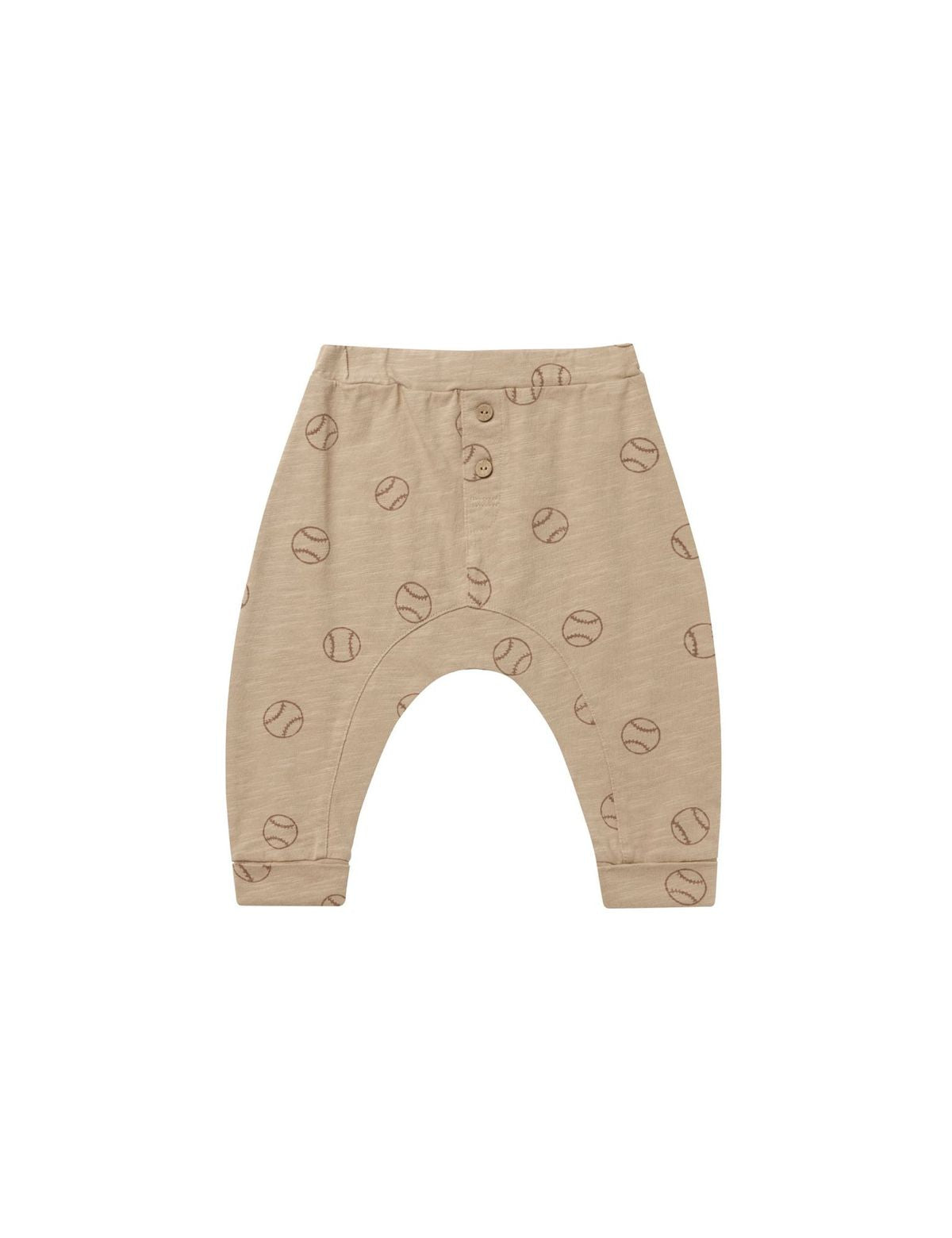 Super-soft slub knit pants with coconut button detail at center front. Featuring rolled leg cuffs, an elastic waistband, and a dropped crotch.