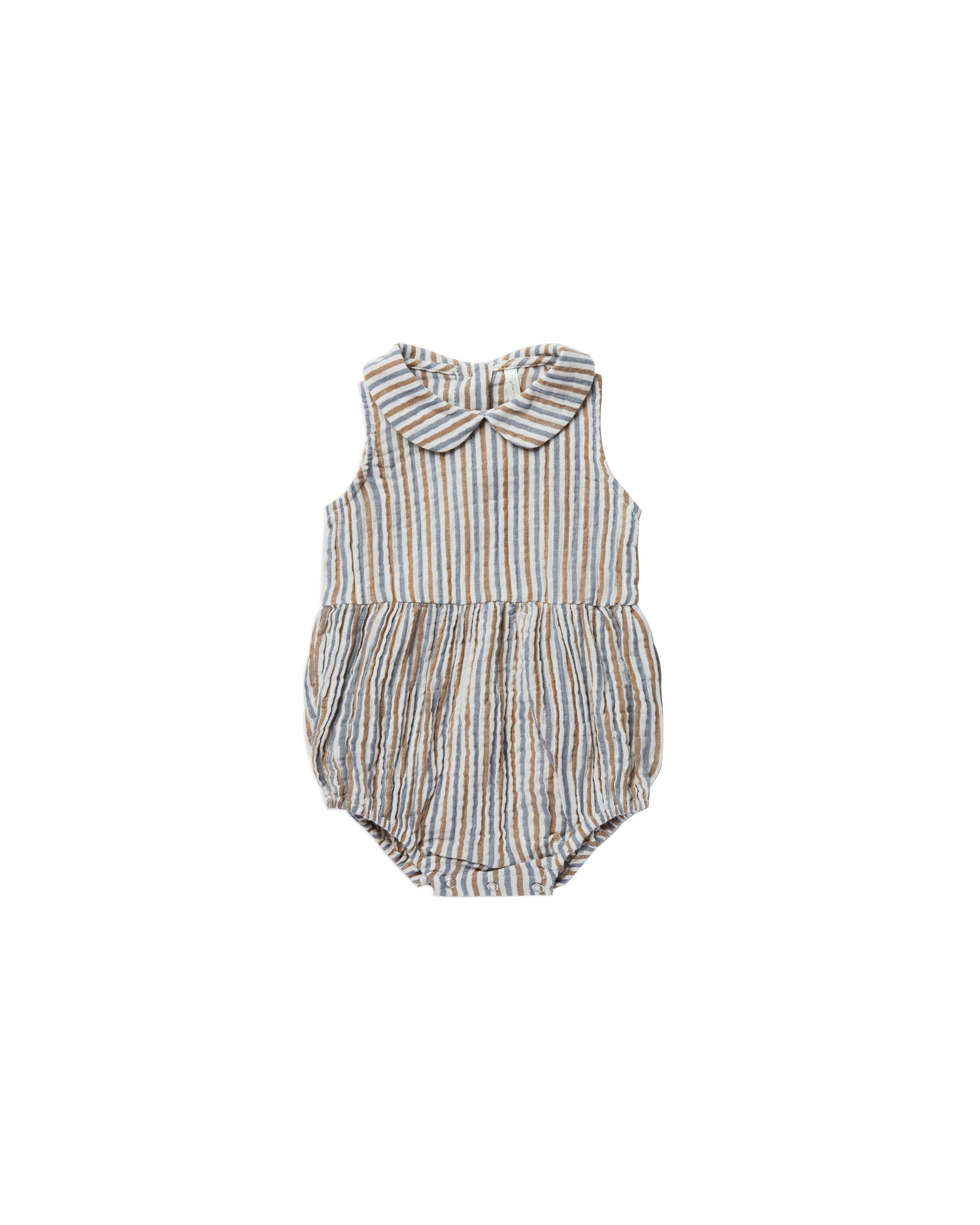 Sweet baby onepiece romper featuring a peter pan collar, button closure on the back for easy changing, and snaps along inseam. Featuring our 'nautical stripe' print.