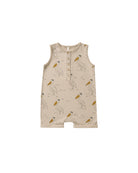 Lightweight french terry romper with wood button center front closure and cuffed leg openings.