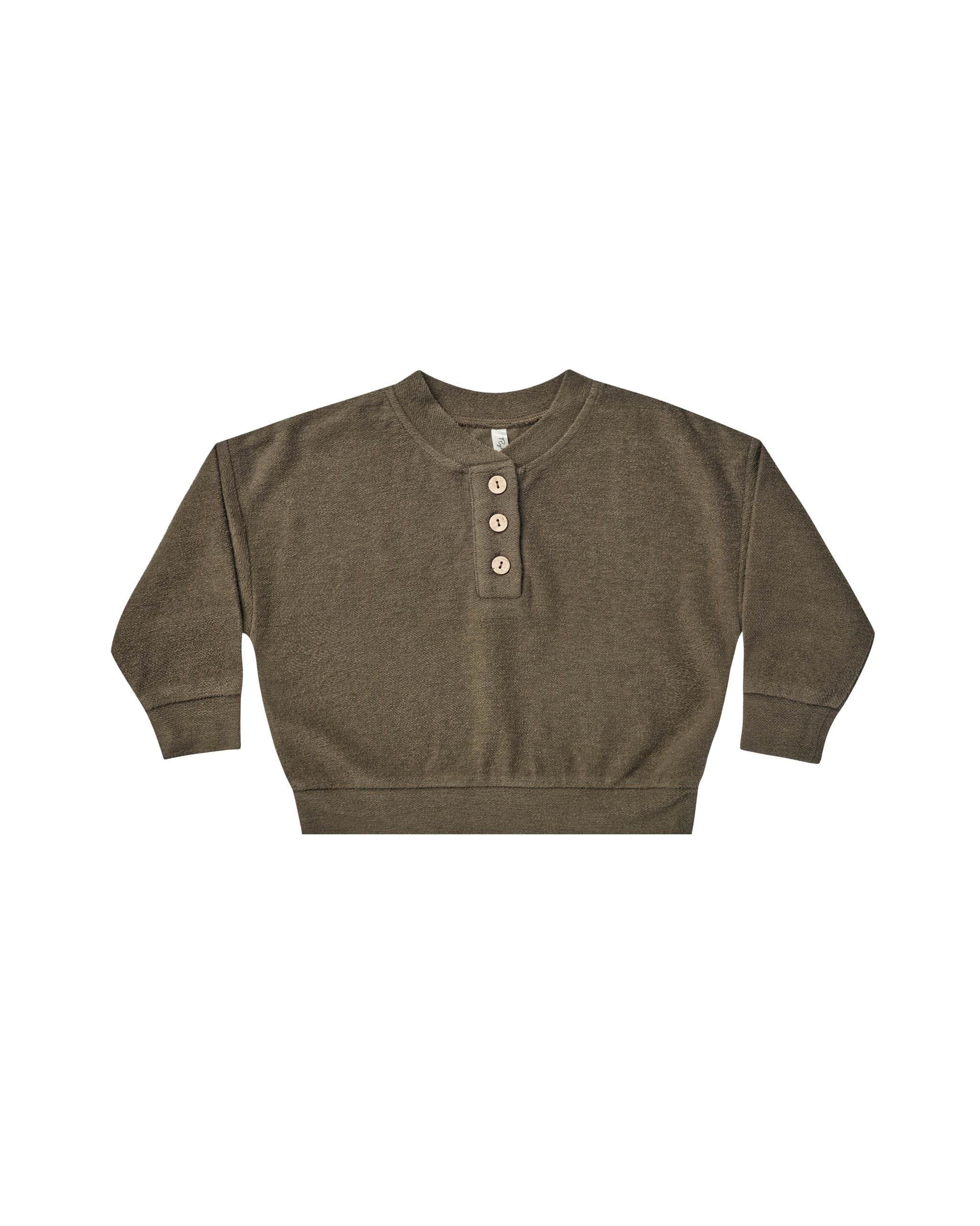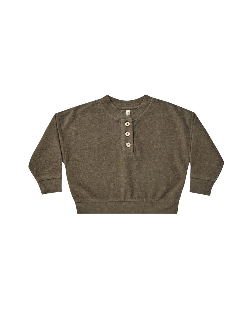 Relaxed fit henley crew neck pullover in a soft and cozy french terry fabric. Coordinates perfectly with our 'button jogger pants.'