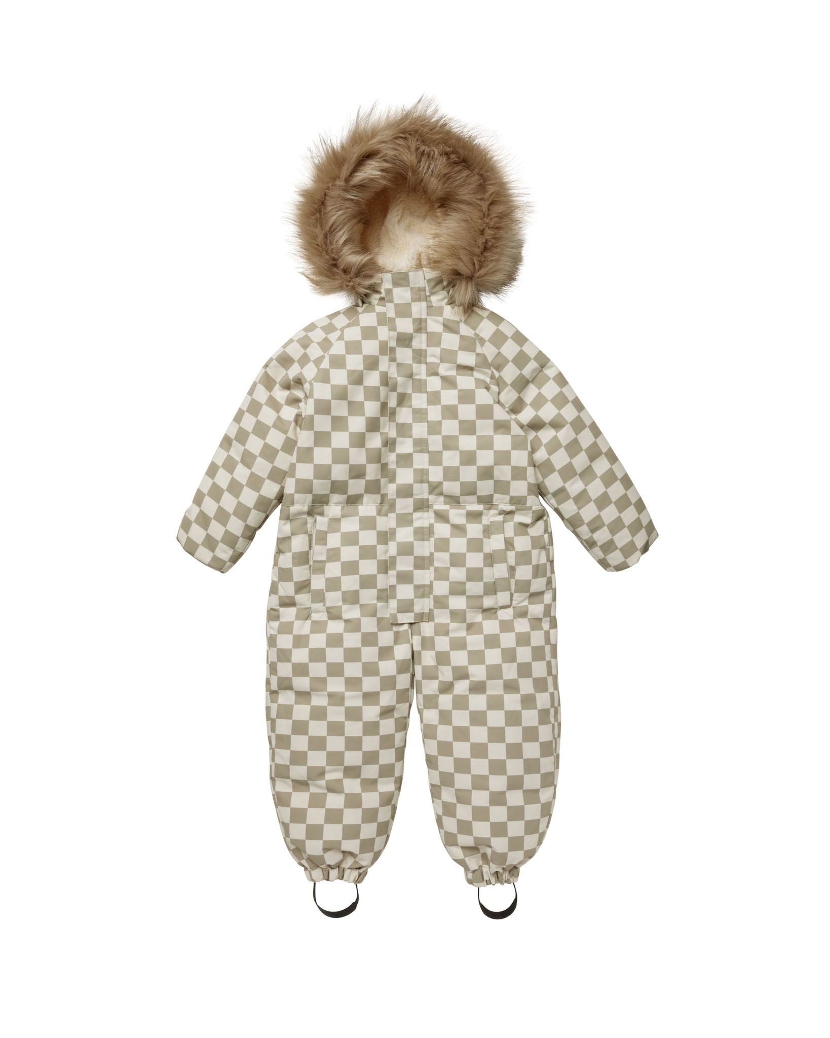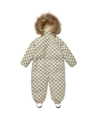 Our snowsuit will keep your little one cozy and cute this winter. Featuring a detachable hood with fur trim, hidden zipper at the front, detachable foot straps, two front pockets. Complete with fleece lining and waterproof material.