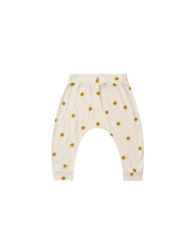 Super soft slouchy cotton jersey pants. Wooden button detail at the center front. Featuring banded leg cuffs, elasticized waistband, and a dropped crotch.