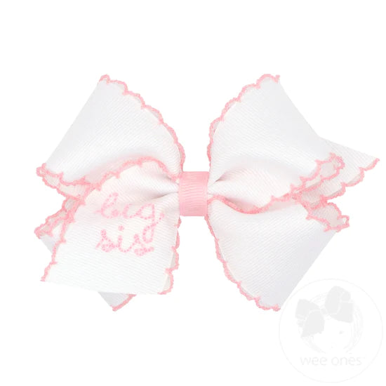 Let the lil or big sister girl show off her ranking with this adorable white grosgrain with pink moonstitch hair bow for girls that's monogrammed with her status on the tail. This bow is sure to stay in her hair all day with our patented WeeStay™ no-slip hair clip.