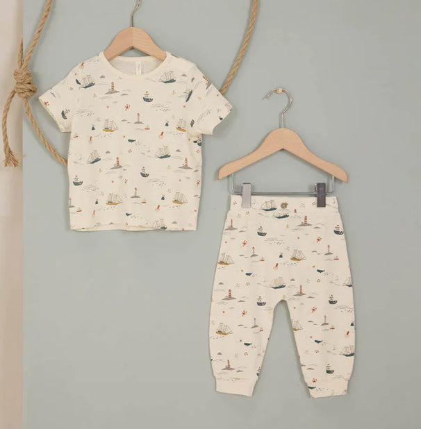 This ultra soft cotton jersey set comes with our basic tee and coordinating slouchy pants with button detail.