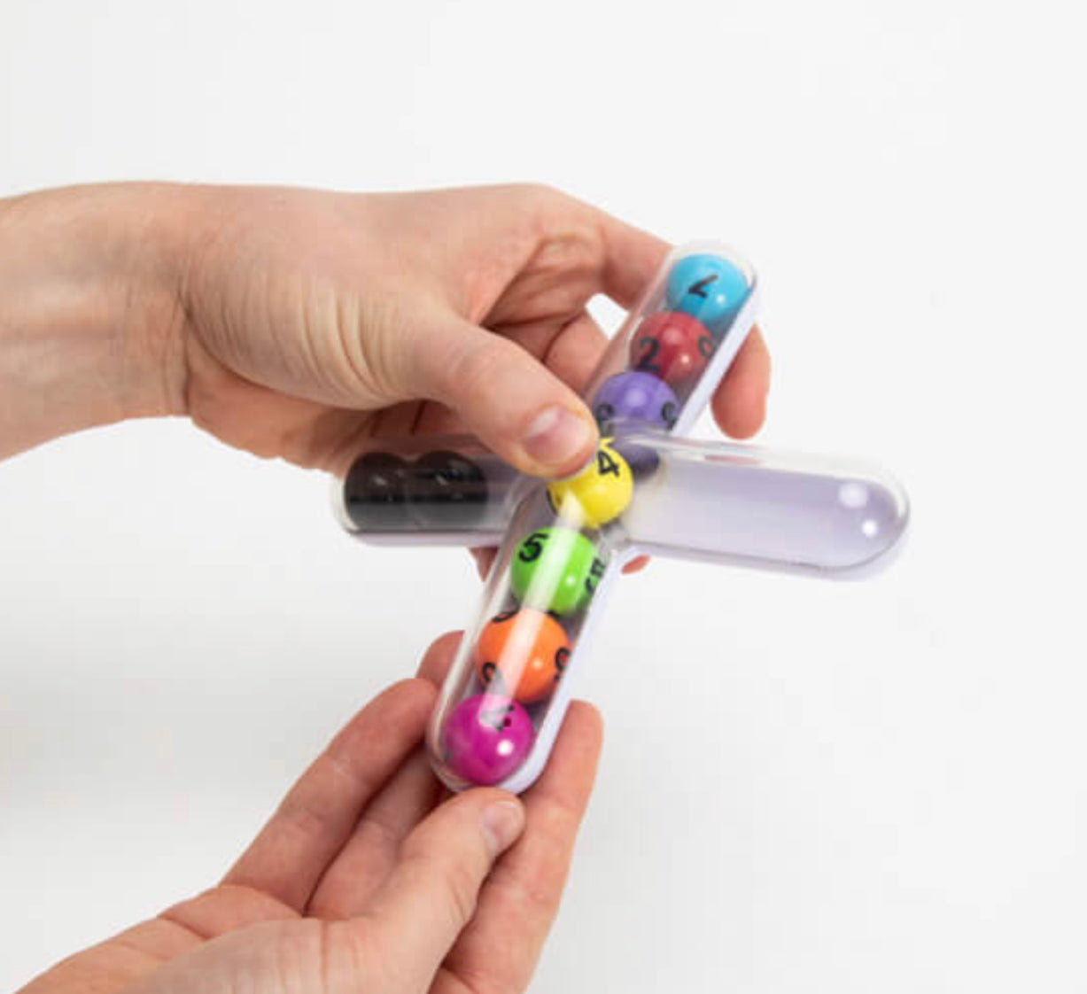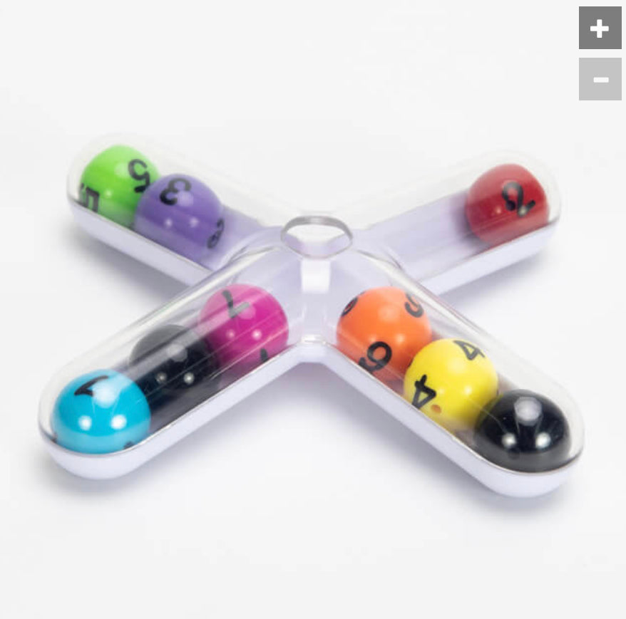 Tilt and roll to arrange the spheres into order, all while navigating around the two blockers. Line them up by number or roll them into a perfect rainbow. Then, use the hole in the middle to hold them in place and show off your win.