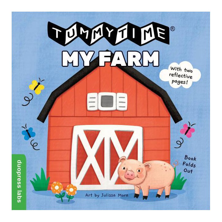 This sturdy accordion book opens up to stand alone in a crib, on the carpet, or on a bed, making it easy for your baby to enjoy tummy time, all the time. One side feature vibrantly illustrated friendly cows, chicks, and ducks, and the opposite side has high-contrast black and white patterns, perfect for baby's developing eyes. And with two reflective pages, your baby can see him- or herself and practice those future smiles!