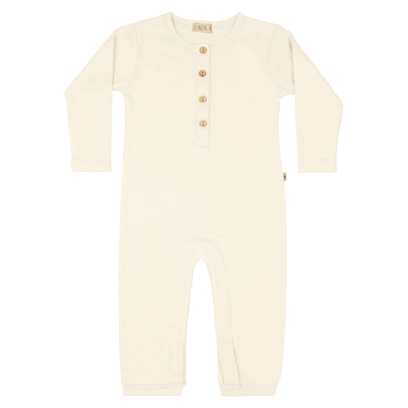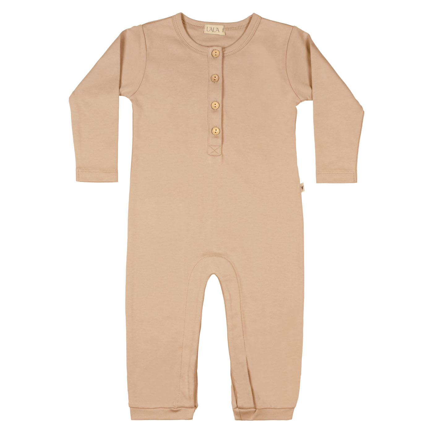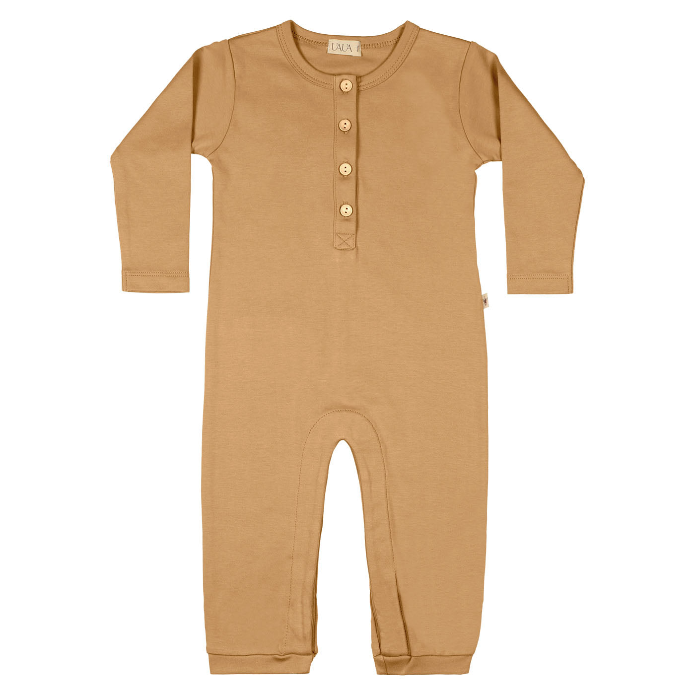 The jumpsuit is designed with inseam snap buttons at the legs for easy changing.