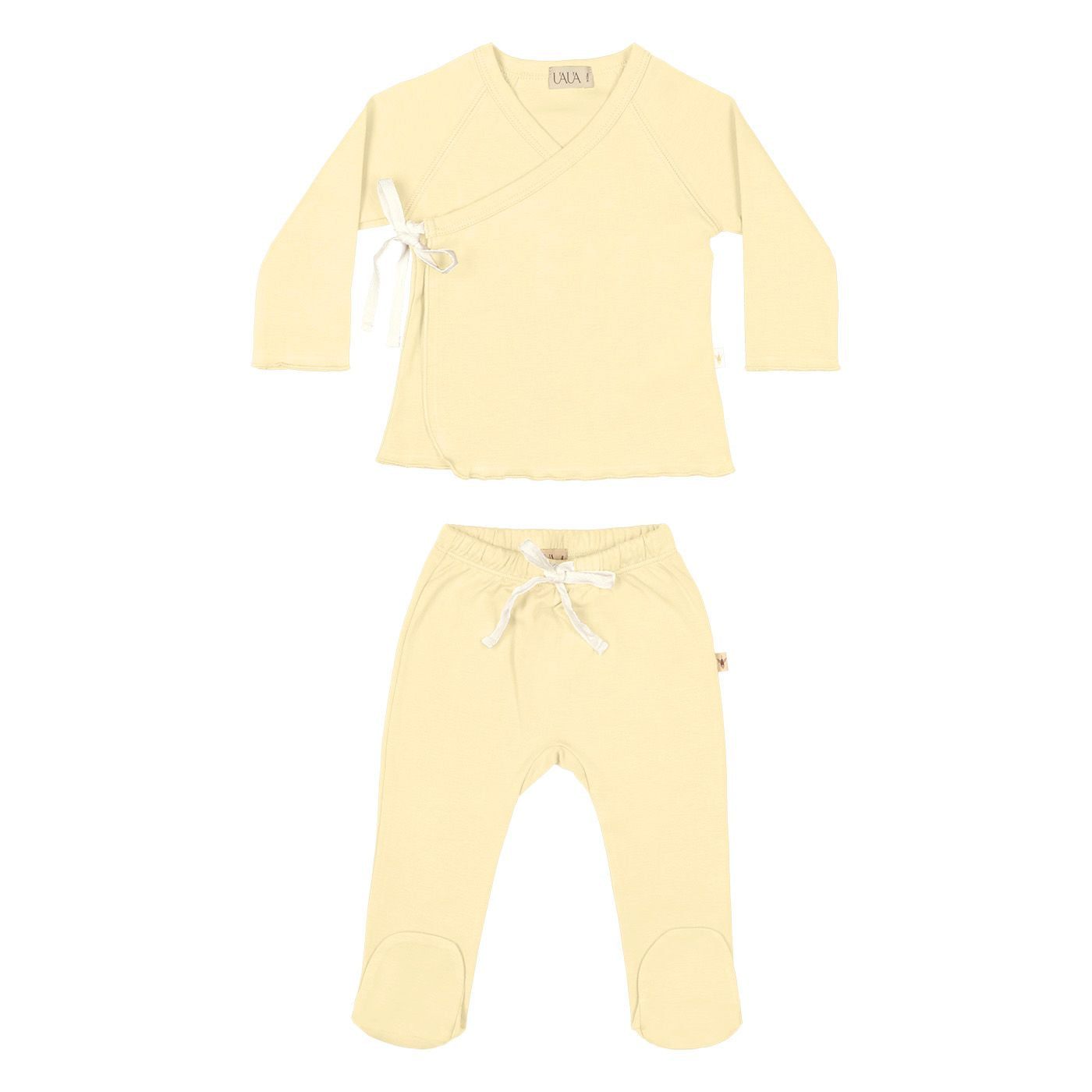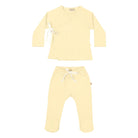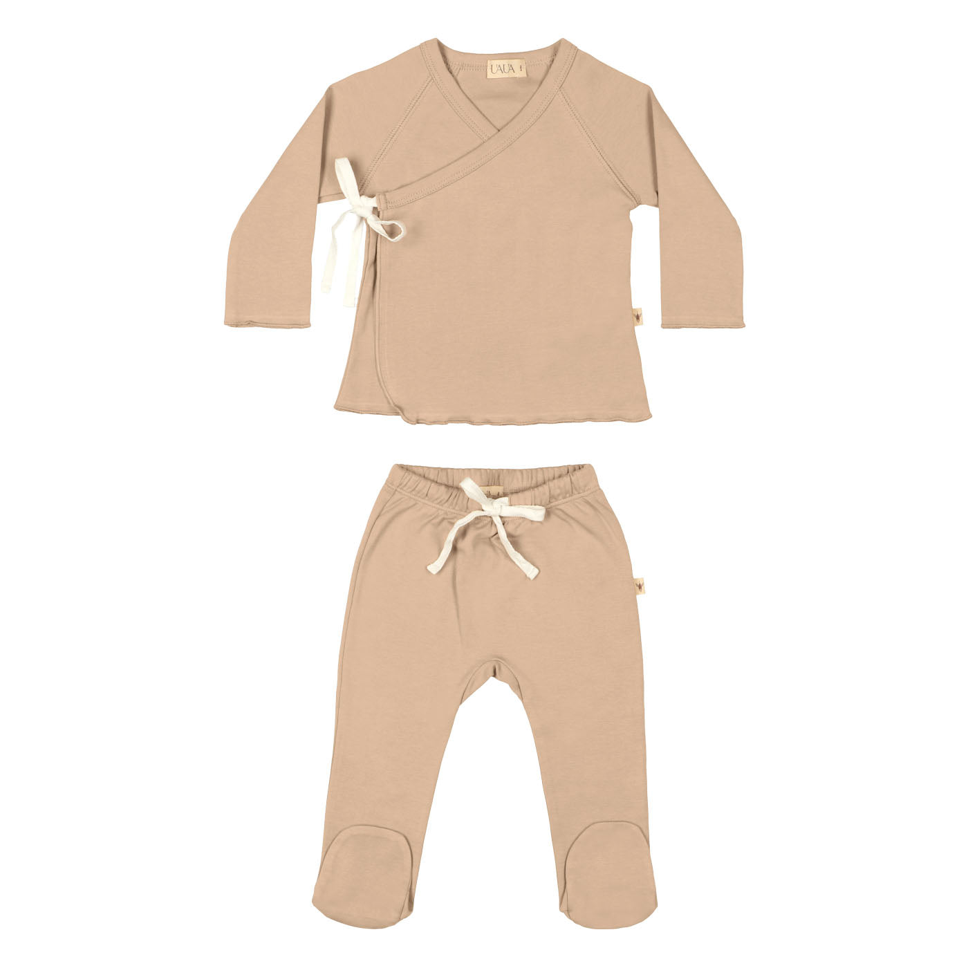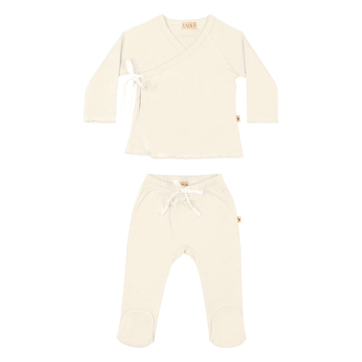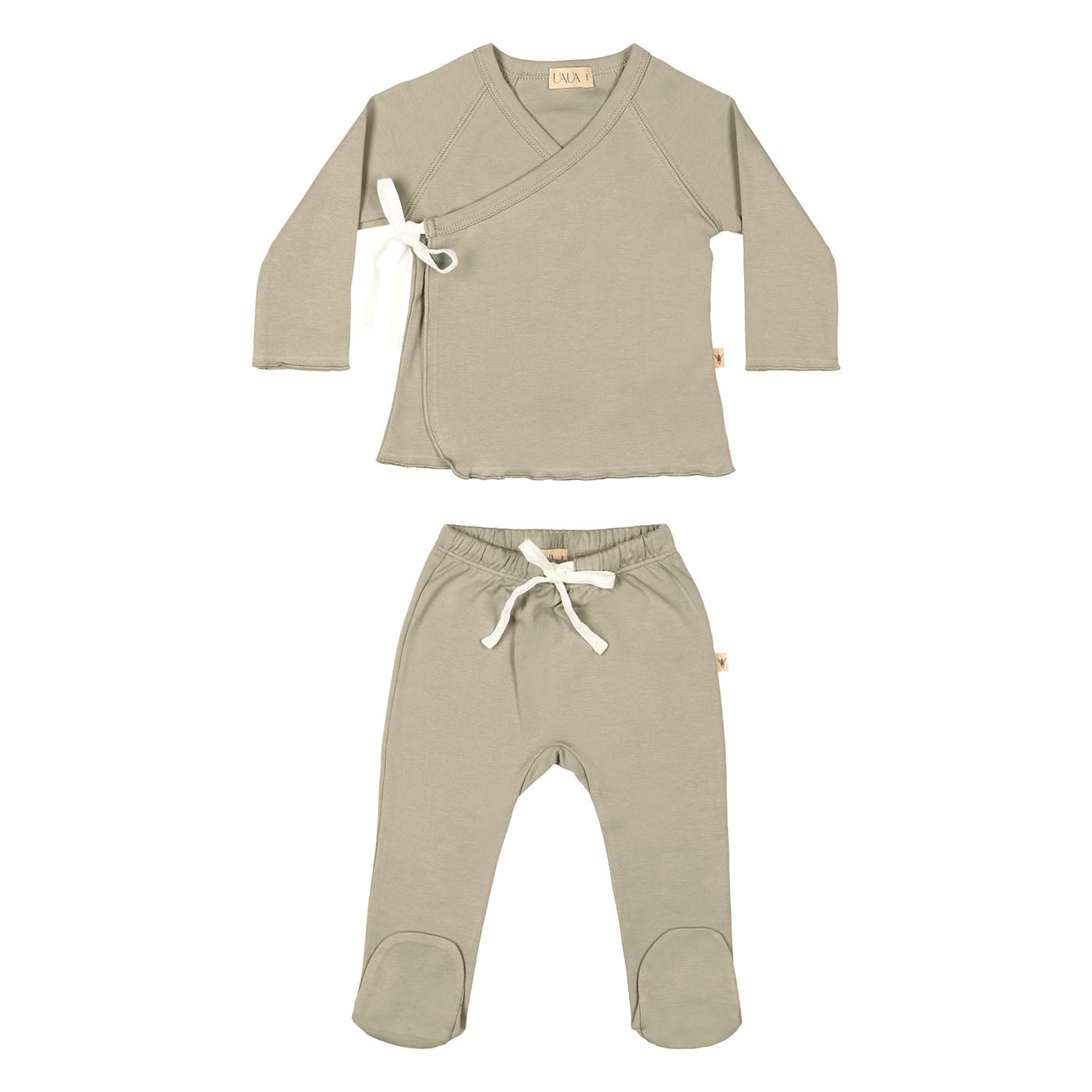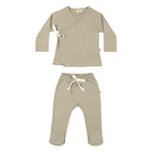 The kimono set exists out of 2 pieces and is designed with an overlap top for easy changes. The pants are designed with an elastic waistband and tie to keep your little one snug.