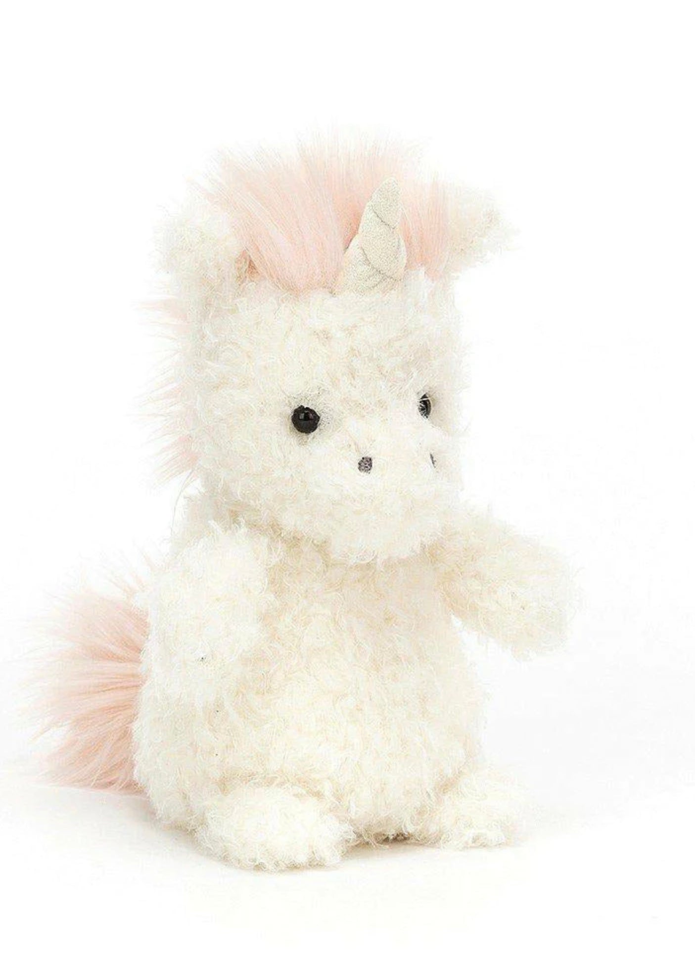 Legend has it that Little Unicorn popped right out of a passing cloud! Tousled in sweet vanilla fur, with a silky strawberry mane and tail, this unicorn has a soft twisty horn shimmering with enchantments. The hooves may be fluffy but the magic is mighty! H7" X W4"