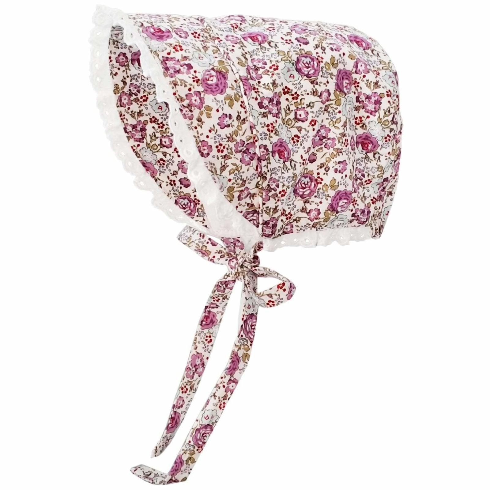 Our classic bonnet made with a darling floral print in shades of lilac helps protect little faces from the sun. Eyelet lace trim around the brim makes this even more feminine. Elastic at back of neck adds a bit of fit. This ties closed to keep bonnet in place.