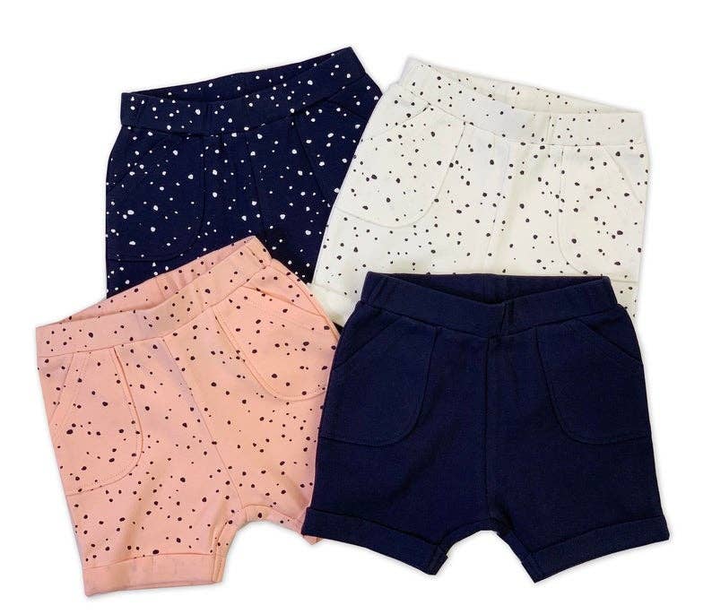 Certified organic interlock cotton pocket shorts, SUPER SOFT! Adorable styling with elastic hem and functional pockets to store goodies. Comfy fit for all day comfort and easy diaper changes. Stylish, lightweight & breathable, all-season and comfy. Modern, cute, classic and adorable. Chemical free & non-toxic formulation, eco-friendly & sustainable. Machine wash and dry, durable and long lasting. Ethically produced in India from small farmer sourced cotton.