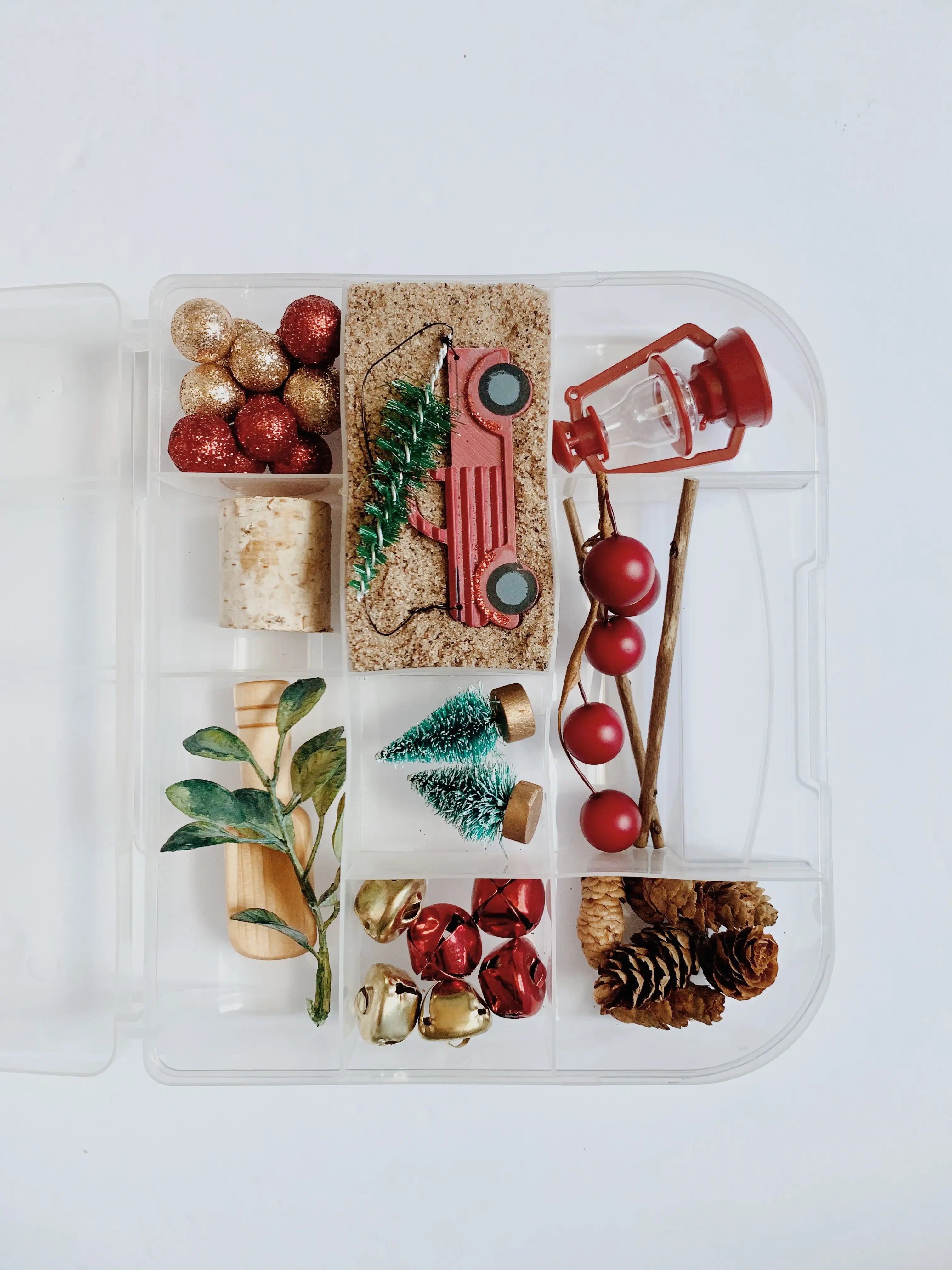 This kit includes - 6oz of kinetic sand - Miniature seasonal trees - Sleigh bells - Pinecones - Miniature lantern - Wood log - Glitter balls - Miniature farm truck -Wood sticks - Wooden scoop - Twig of berries This kit is not intended for children under 3 years of age due to small pieces and choking hazards. Adult supervision is always recommended!