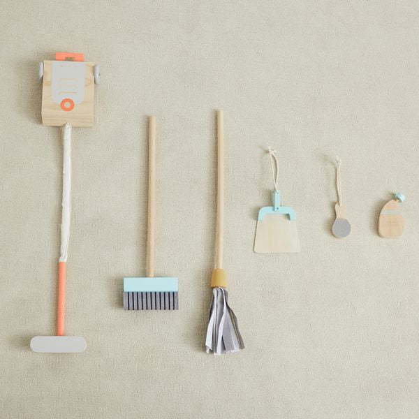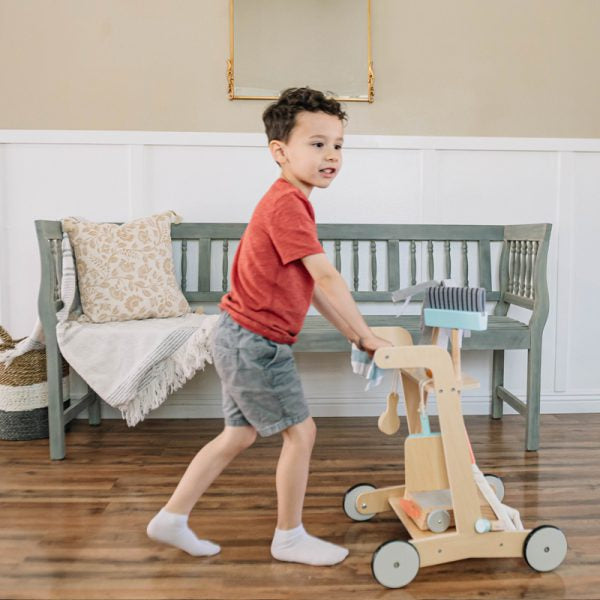 Give them an early start with our Smart Cleaning Cart. Made of pine, cherry and plywood, our cleaning cart includes a broom and dustpan, mop, vacuum, cleaning bottle, scrubber, and cotton dust cloth, all nestles into a nifty storage cart on wheels. Pretend play is now super clean fun!